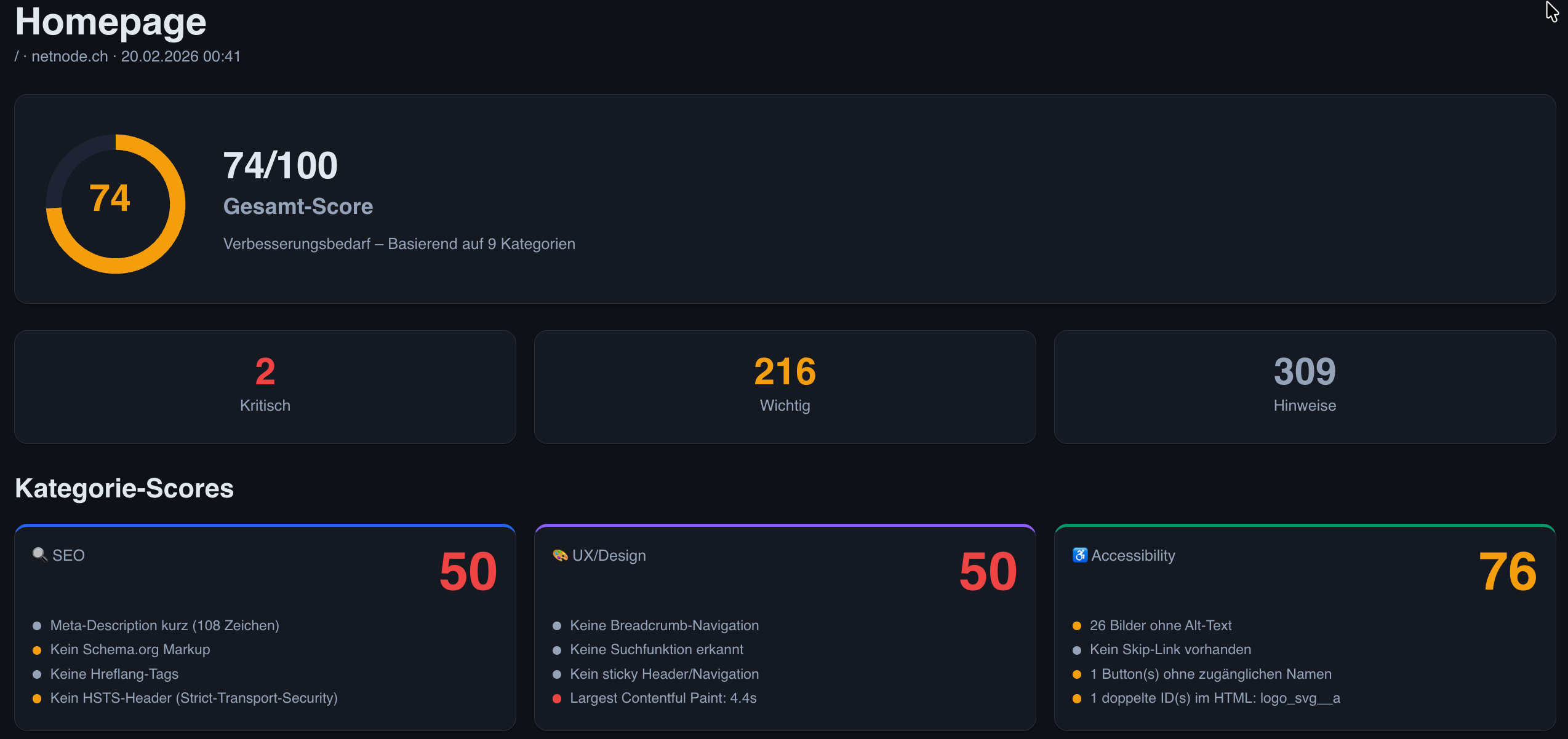 mm@netnode.ch079 777 77 91Die Website netnode.ch hat einen durchschnittlichen Score von 68, was auf Verbesserungsbedarf in den Bereichen Benutzererfahrung (UX) und Suchmaschinenoptimierung (SEO) hinweist. Besonders kritisch sind die Ladezeiten und die fehlende Implementierung von strukturierten Daten.